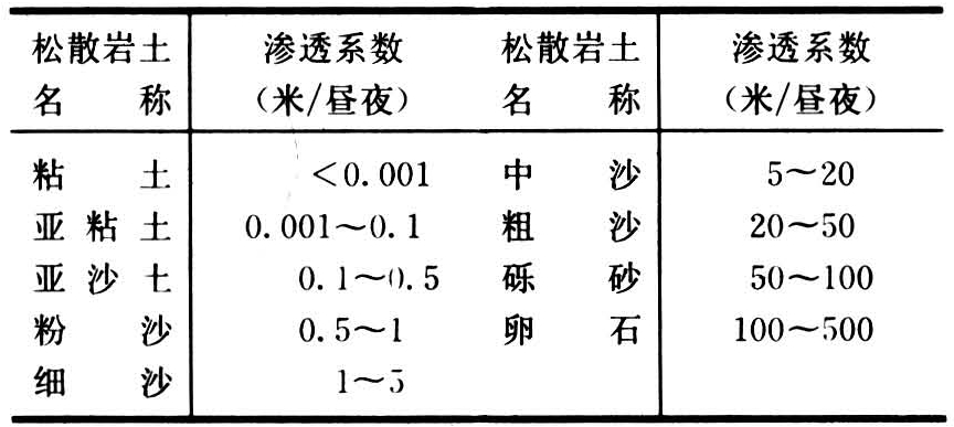 根据渗透系数的大小,岩土的透水性可分为如下几类:良透水(K>10米/昼夜),透水(K为10~1米/昼夜),弱透水(K为1~0.01米/昼夜),极弱透水(K为0.01~0.001米/昼夜),不透水(K<0.001米/昼夜)。