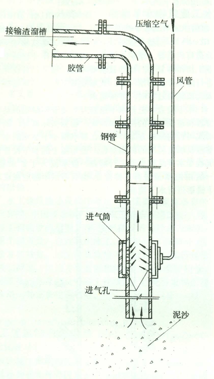 水下清基 不论是或金属结构,在对破坏或缺陷情况做全面检查之前,或是在实施水下维修方案之前,都要对表面进行清理。清理方法视基面情况而异:当水生物覆盖或水垢、水锈较轻时,用钢丝刷、刮刀、砍斧、凿子、风动砂轮等手工工具清理;较重时则用高速射流水清理,它不仅能把混凝土冲成骨料露出的表面,而且可在混凝土中切出孔洞或剔出槽子。对水下结构维修前后的基坑清理工作,在中国一般是由潜水员辅以其他提升、运输工具进行。当基坑工作面和清基工作量大时,视水的深浅选用挖掘机、挖泥船或图2所示吸泥管进行清理。