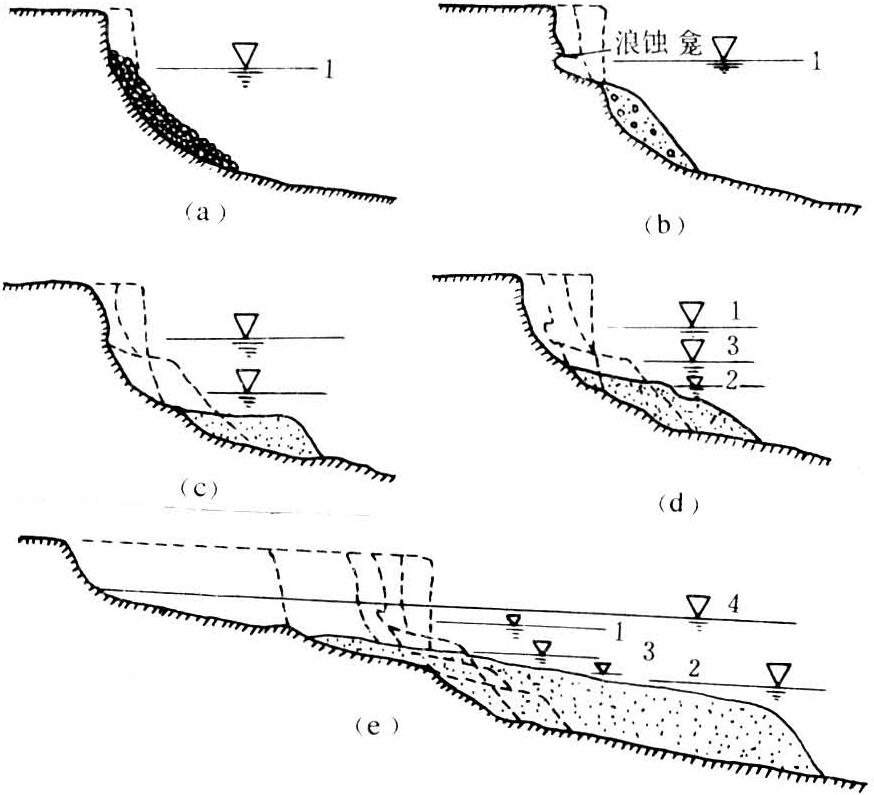 塌岸的发生和发展可分为三个阶段:①库岸土体性质的变化,库水位升高后改变了库岸土体的容重、含水量、孔隙率、塑性、内摩擦角和内聚力,引起土体结构变化并发生软化和崩解现象,这就改变了库岸的稳定条件;②岸壁的破坏和坍塌,由于水面展宽,水深加大,风浪作用增强,拍岸波冲击和磨蚀岸壁,下部土体被掏空和破坏,上部土体失去平衡而塌落;③塌岸物质的搬运和堆积,坍塌物质受波浪的搬运与分选作用而堆积在一定地区,又经沿岸流搬运而顺岸线迁移,逐渐形成浅滩。上述过程反复进行,不断发展,直到水上岸壁和水下浅滩达到相对平衡,波浪掏刷对岸壁的破坏基本不再起作用时,库岸才趋于稳定(见图)。