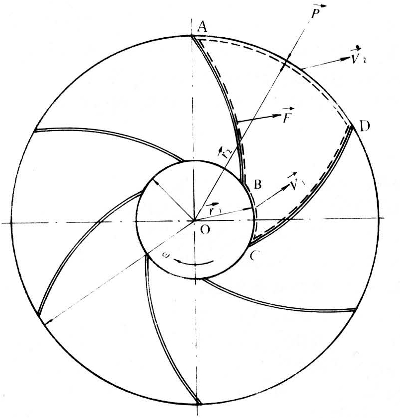 为从选定点至相应质量中心处的半径向量(见图)。ABCD流道在某瞬时所占据的空间为所讨论的空间。水流从半径为r1的转轮内周流入,从半径为r2的转轮外周流出。(m