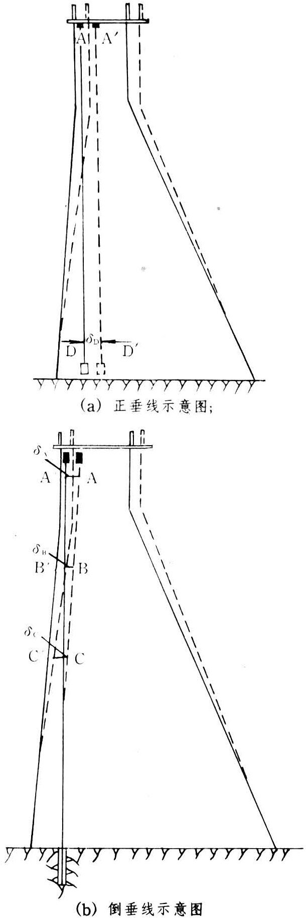 垂线法 观测混凝土坝和砌石坝的水平位移和挠度可采用垂线法,即用垂线作铅直基准线,测量沿垂线不同高程各测点水平方向的位置变化,求得各测点的水平位移量,见图3。