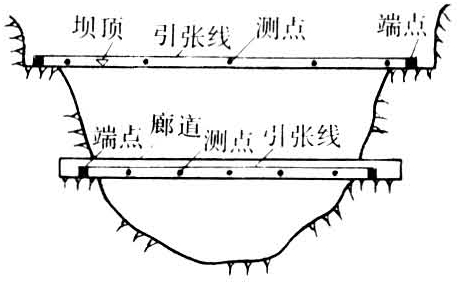 引张线法 在两个工作基点之间用一条不锈钢丝,两端施加张力,使之引张为一直线(指悬链线的水平投影),用于测量直线坝型各坝段的水平位移(见图4)。引张线是通过坝顶或坝内水平廊道固定在大坝两端的不锈钢丝,两端点设置在两岸基岩上,或以倒垂线测点作为基点。各坝段测点设置浮托器和专用量具或引张线遥测仪,测量各坝段测点和引张线之间水平方向的相对位移,即坝体各测点水平位移。