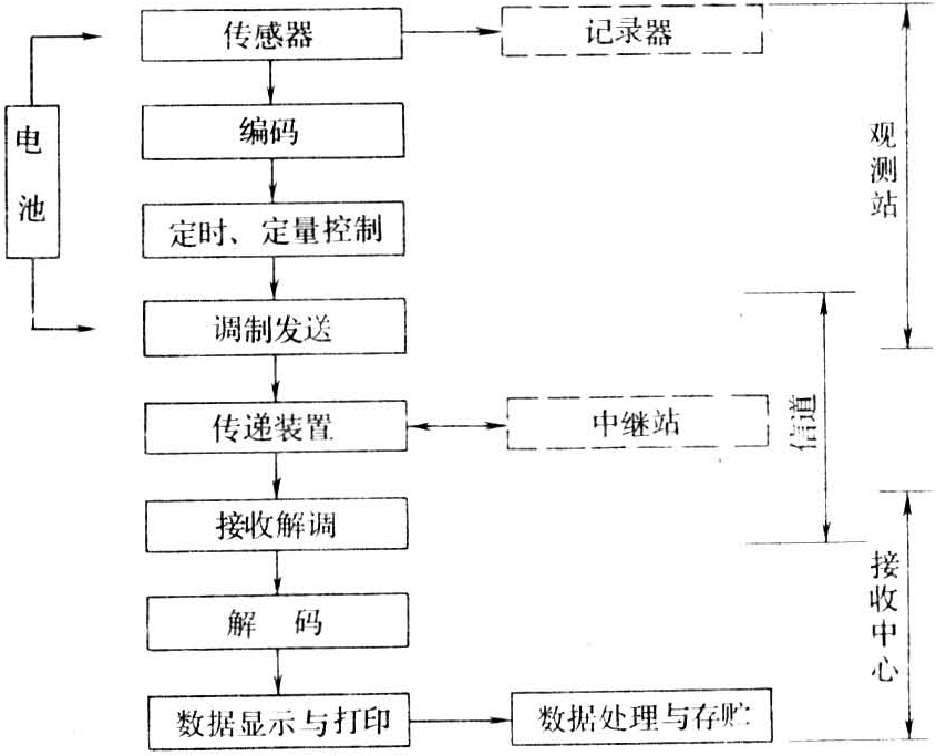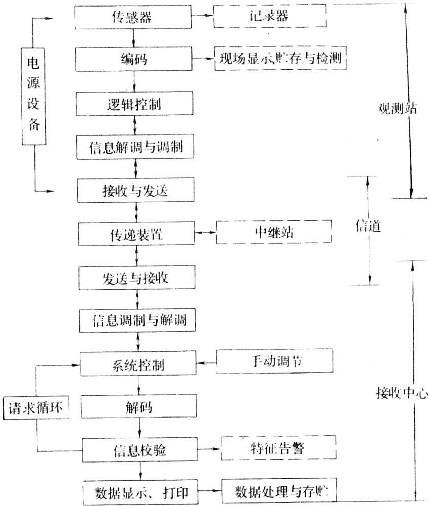 为收集、传递和处理水文实时数据而设置的各种传感器通讯设备和接收处理装置等的总体由观测站、信息传输通道和接收中心三部分组成。主要用于防汛和水利调度。在小流域范围内只需几分钟时间即能完成数据收集和处理,及时提供重点河段、水库的雨情水情。现行的系统工作原理见图1、图2。虚线框图为可选择的附加部分。