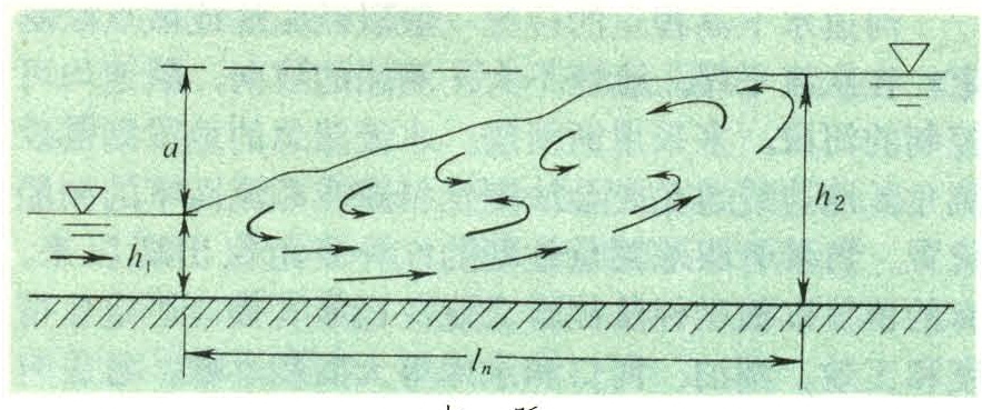 明槽水流从急流状态过渡到缓流状态时水面骤然跃起的局部水力现象(见图)。水跃区的水流可以分为两部分:一部分是底部的主流区,流速由快变慢,水深由小变大。另一部分是表面旋滚区,水体翻腾滚动,饱掺空气。但是主流与表面旋滚不能截然分开,因为在两者交界面上流速梯度很大,水流内部产生强烈的摩擦混掺作用,紊动极为强烈,消耗大量的机械能。水跃可有以下的作用:用于水工建筑物下游的消能,防止河床的冲刷;借助水跃的激烈紊动,使液体内部所含其他物质混掺均匀;城市供水系统水流的掺气和除气。在确定水跃区的范围时,通常将表面水滚的前端称为跃前断面,该处的水深称为跃前水深,用h1表示;表面水滚的末端称为跃后断面,该处的水深称为跃后水深,用h2表示。跃前与跃后水深的差称为跃高a,跃前和跃后两断面之间的距离称为水跃长度1n。平底无阻力棱柱形明槽的水跃基本方程可以由水跃区的动量方程求得为: