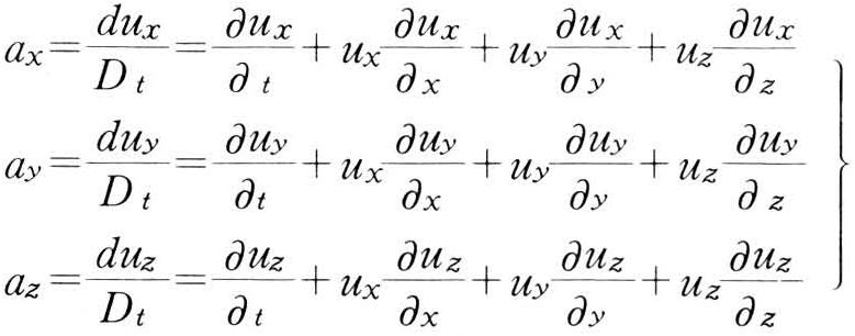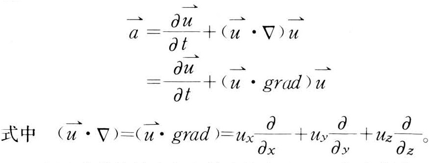 式中 第一项为当地加速度,反映流动的非恒定性,在恒定流动中当地加速度为零。式中其余各项为迁移加速度,反映流动的非均匀性。在各处速度都一样的流动中,迁移加速度为零。加速度可用矢量方程表示为: