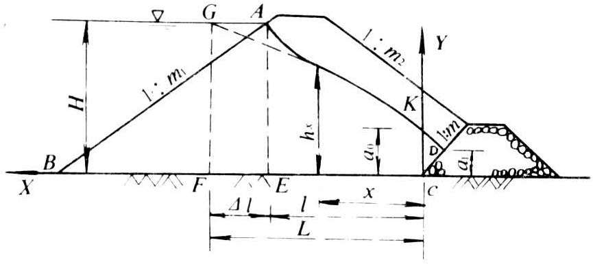 下游部分坝体中的浸润线位置由下式求出: