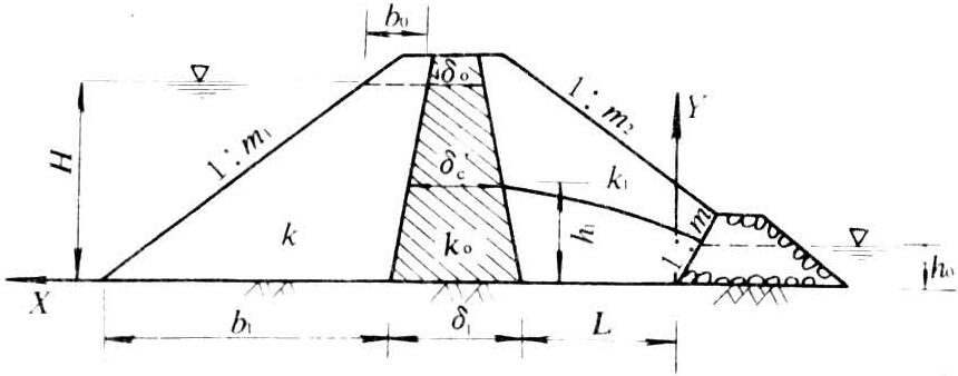 图2 有堆石滤水坝趾心墙坝的渗流计算图