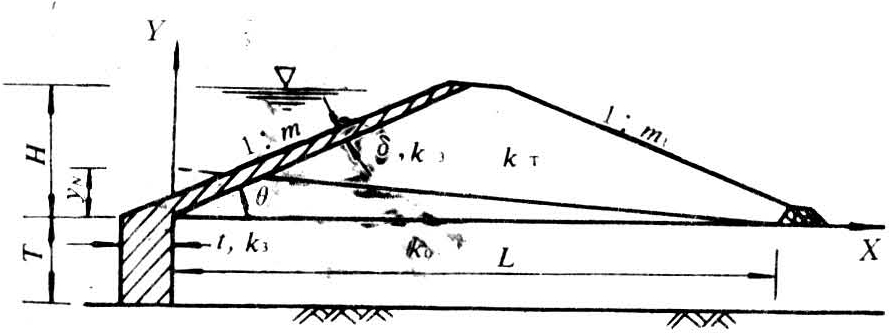 ③有限深透水地基上带隔水墙及堆石排水的塑性斜墙坝,下游无水的情况(图3):