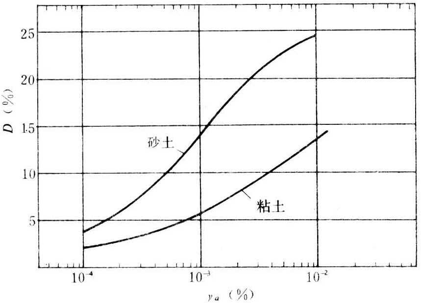 阻尼比 相对于单自由度粘弹性振动体系中的阻尼比,土的阻尼比只有当量或等效的意义,常用往返剪切试验(如往返扭剪、往返单剪和往返三轴试验等)测定。根据往返剪应力τ与往返剪应变γ形成的滞回圈(见图1),定义土的阻尼比D=(1/4π)(△W/W),其中△W为滞回圈包围的面积,W=τaγa/2。此外,土的阻尼比也可从自振衰减曲线或共振曲线中推求。前者可得D=(1/2π)δ,其中δ为对数递减率。后者可得D=(f″-f′)/(f″+f′),其中f′和f″分别为共振曲线上振幅等于(1/)(共振峰值振幅)处小于和大于共振频率的两个频率值。D一般随γa的增大而增大(见图3)。