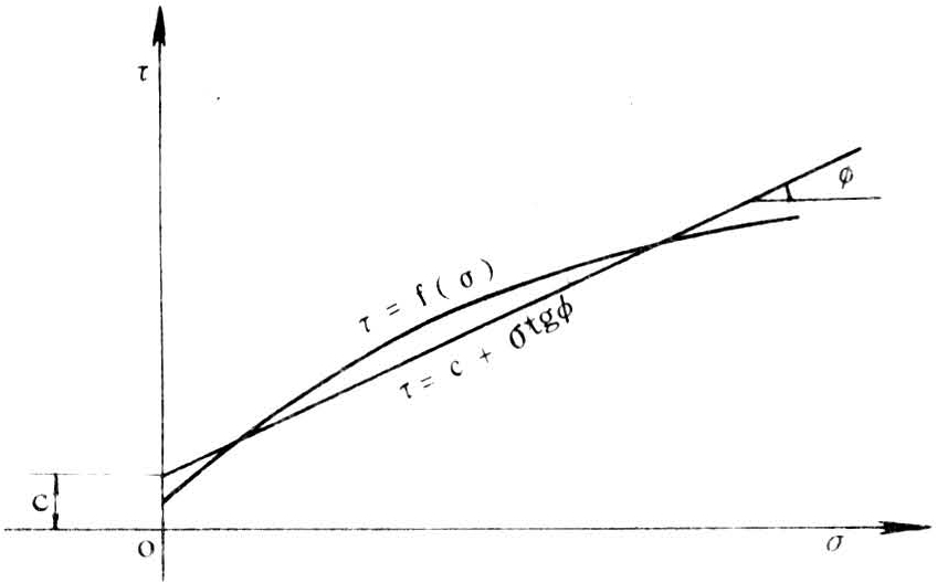土力学中采用莫尔——库伦强度理论来论述土的破坏。莫尔认为材料的屈服和断裂所形成的破坏是剪切破坏,破坏面上的法向应力σ和剪应力τ有下列函数关系: