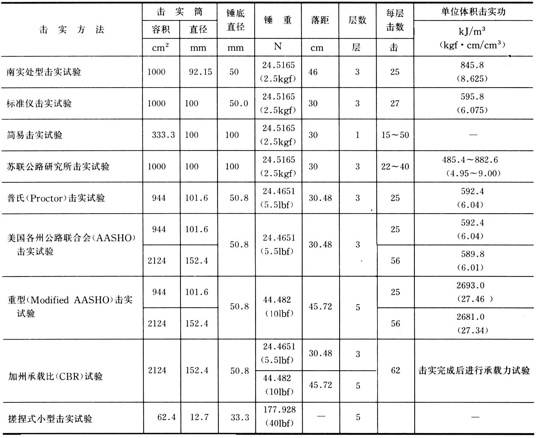 粘性土室内击实试验有好多种,它们可以模拟现场压实设备达到的结果。中国多采用南实处型击实试验(1984年改为标准仪击实试验),简易击实法有时也应用。国际上普遍采用普氏击实试验和重型击实试验,前者多数用于土坝、公路填方等,后者常用于承受重型荷载,如机场和公路的基层。后者的击实功能较前者高4.55倍。还有一种搓捏式小型击实试验,主要用于研究工作。这些试验的标准规格见表。