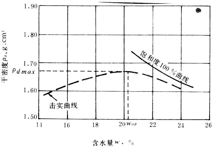 土料的压实性能常用室内击实试验测定。室内击实试验中制备五、六份不同含水量的粘性土料,每份土料用相同的击实方法,测出不同含水量的击实干密度,其连线称为某功能下的击实曲线(如图)。击实曲线上干密度的最大值称为最大干密度;对应最大干密度的含水量称为最优含水量,落锤下落对单位体积的土所做的功称为击实功或单位击实功;土在已知击实功下能够在最优含水量时最有效地击实。