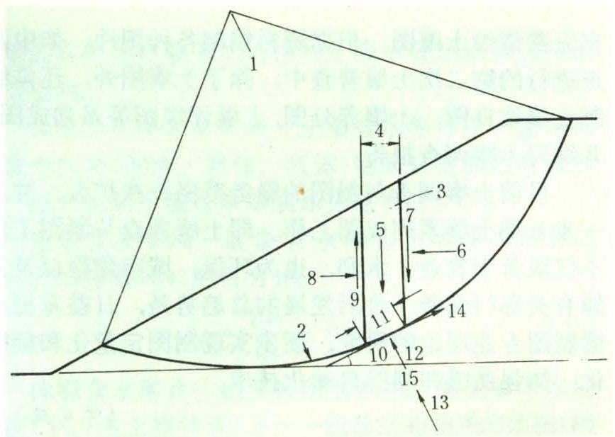 这种方法的主要步骤是,先假定一个滑动面,然后把滑动土体分成若干垂直条块,作用在某一条块上的力表示在图中。由于所需求得的未知数多于求解的方程,因此,属于静不定问题,必须作出相应的假定才能求得作用在条块底面上的法向力和切向力,从而算出安全系数。早期广泛采用的瑞典圆弧法假定条块之间的作用力为零