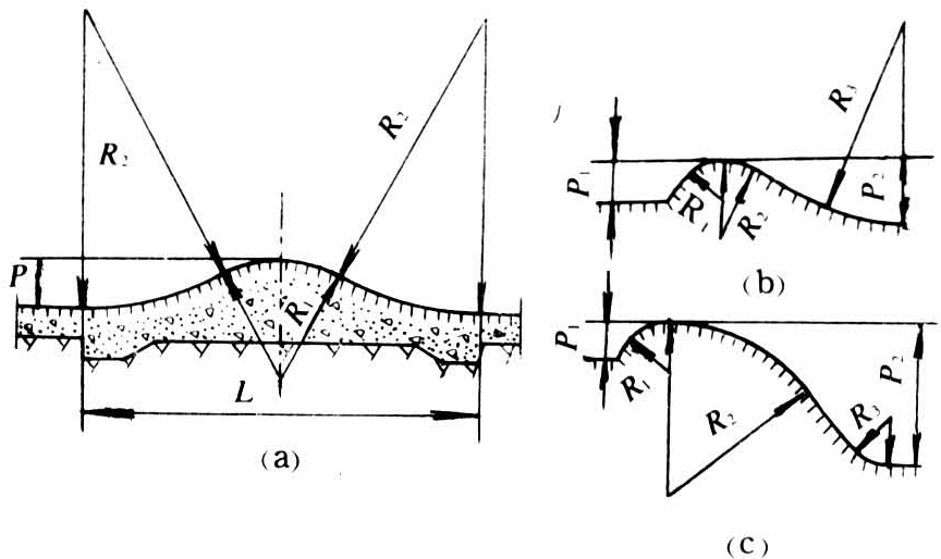 剖面由不同半径的圆弧复合而成的低溢流堰。其水流特点介于实用堰与宽顶堰之间(见堰流)。驼峰堰堰身较宽,地基应力较均匀,整体稳定性较好,适用于软弱地基。驼峰堰高度一般较小,堰前水流行近流速较大,堰上游不易淤积泥沙;对于相同高度的底板,设置高度不大的驼峰堰可增大流量系数且能减少闸门高度,常见的驼峰堰剖面如图a所示,其流量系数较宽顶堰大,一般在0.42以上,随堰高与堰顶水头的比值P/H的变化而变化,最大可达0.468。设计时流量系数一般选用0.40左右。堰顶水头过大时,堰下易发生淹没,流量系数将减小。在溢流堰面内增加斜坡的直线段长度,可加大下游堰高,从而减小淹没度或避免淹没,如图b、c所示。