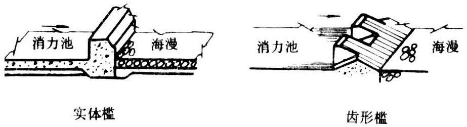 消力槛可做成实体槛或齿形槛。实体槛断面一般为折线或曲线形实用堰,迎水面常采用直立面。试验表明,直立面对水流的反击力大,消能效果较为显著。齿形槛对水流的反击力小,其效果仅相当于(高槛高度加低槛高度)的直立槛,但有助于槛后水流的横向和竖向扩散(见图)。