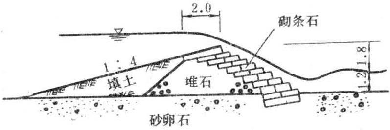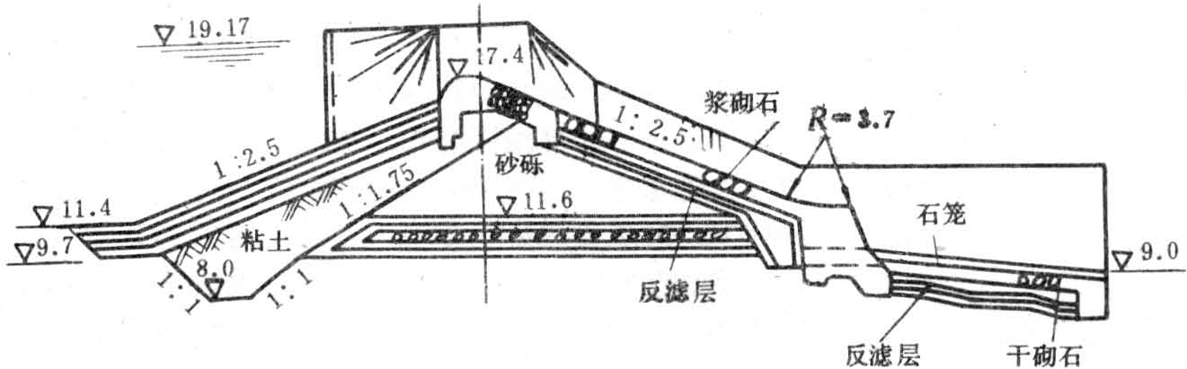 20世纪50年代以来,中国新创了多种类型的溢流土石坝,包括溢流堆石坝、干砌石溢流坝、浆砌石及沥青混凝土护面的土石坝等,高度从几米至20余米,单宽溢流量达20米3·秒-1·米-1以上。图2为辽宁鞍子河浆砌块石护面的溢流土坝,高7.4米,坝基为淤泥和灰红色粘土,坝长102米,设计溢流量537米3/秒,1976年建成后已长期安全运行。