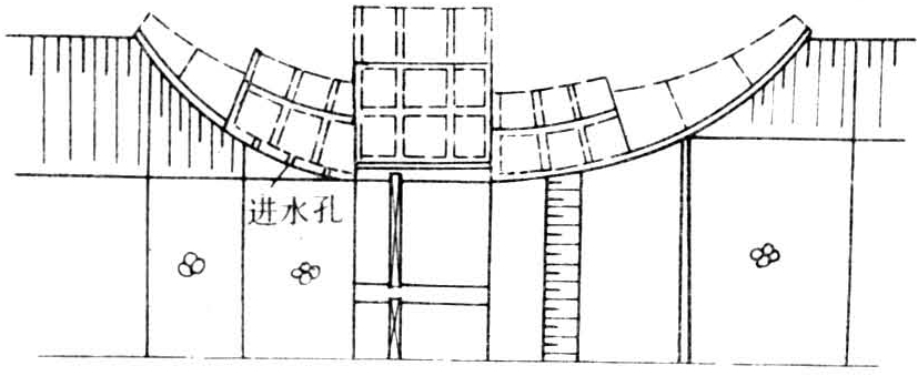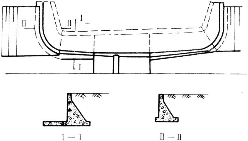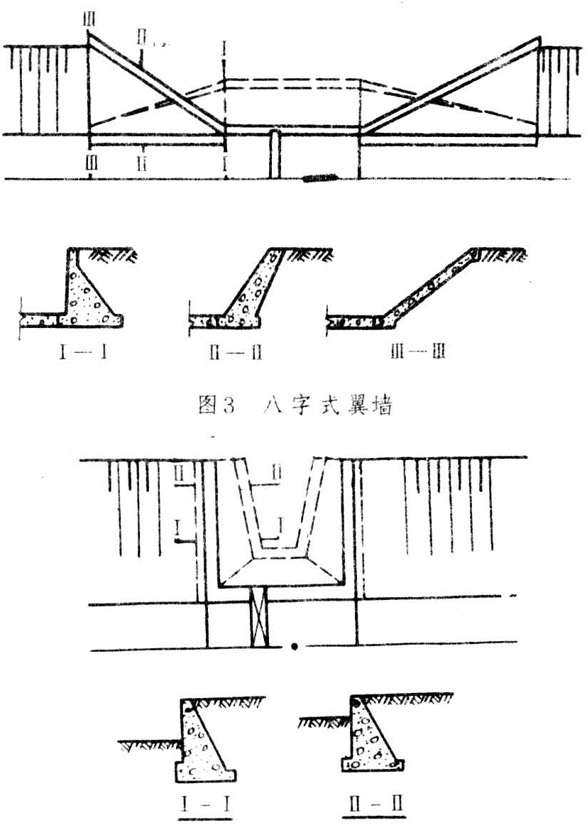 翼墙按平面布置形式可分为:①反翼式翼墙(又称直角式翼墙,图1),由顺流段和垂直水流段的直立墙组成。转折处易产生回流,且工程量较大。②渐变曲线式翼墙(图2),平面布置为圆弧状、椭圆弧状或其它曲线形,迎水面为直立墙。由于进口收缩和出口扩散段是渐变曲线形的,水流比较平顺。③八字式翼墙(图3),即进口直线收缩,出口直线扩散,在平面成八字形的翼墙。其优缺点介于反翼式与渐变曲线式之间。④一字式翼墙(图4),即顺水流段翼墙长度为零的反翼式,由于进出口过流断面突变,水流条件最差,但工程量最小。上述各类翼墙,当迎水面为直立时,与上下游梯形断面的河渠连接,将使水流流向有不同程度的转折,不能完全满足水流渐变的设计要求。如将迎水面改为渐变的扭曲面,将使进出口水流更加平顺,扭曲面常在八字式翼墙上采用,但施工比较复杂。高度较大(10米以上)的水闸,翼墙顶部高程可从闸室开始分别向上下游逐渐降低,以节省工程量;这种斜降式翼墙常用于江河堤防的排水闸,但墙顶不宜降至下游排水位以下,否则出闸水流条件较差。当由于闸基较差,以致不宜设置挡土墙式岸墙、翼墙时,则可将水闸的两岸连接建筑物均采用护坡型式,成为斜坡式翼墙,又称无翼墙连接,如图5。斜坡式,在中国的河北、山东、北京等省、市采用较多,运用情况尚好。翼墙布置与型式的选用,主要应考虑水流条件、工程量、施工条件等三个方面。例如,对于水头高、单宽流量大的水闸,应采用渐变曲线式,以使进出口的水流平顺衔接,提高过流能力,有利于下游消能防冲;对于一般小型水闸,则应力求结构简单,施工方便。翼墙一般为挡土墙结构,其结构设计见挡土墙。