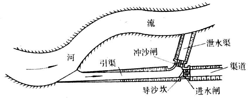 进口及进水闸前可设导沙坎以提高防沙效能。为保证水力冲沙,工程布置应使引渠能获得较大的冲洗水头,否则需要机械挖除淤沙,增加管理上的困难。有些取水口,特别是平原地区的取水口,常难满足这一要求,故引渠式取水的应用范围有一定的局限性。
