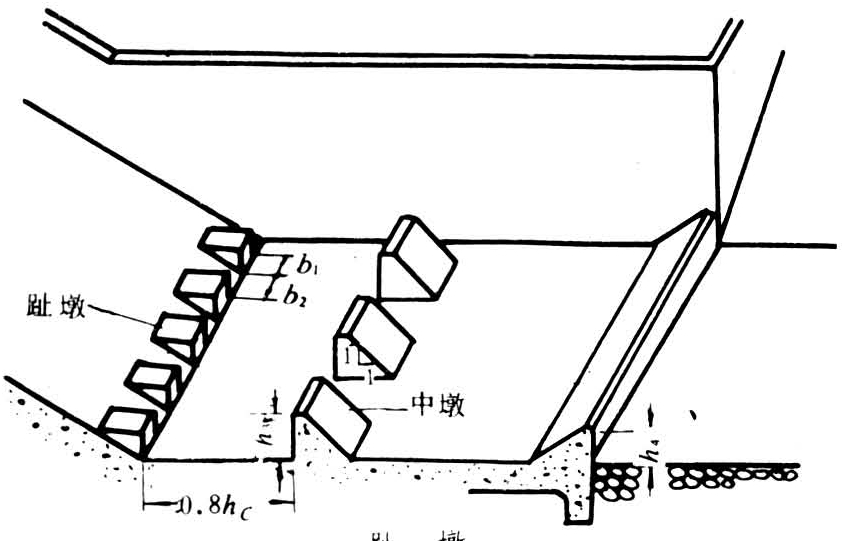 设置在消力池斜坡坡脚附近的墩形辅助消能工。其作用是分散入池水股,增加水跃区中主流与旋滚的交界面,以加剧紊动掺混作用,提高消能效率(见图)。单独加设趾墩可使收缩断面水深增加,使水跃第二共轭水深减小,从而可减小消力池深度。