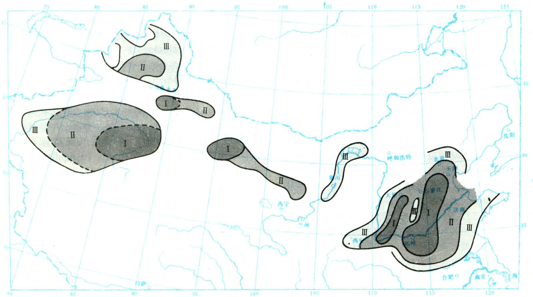 以干热风年平均日数和天气过程年平均次数作主导指标,以干热风年型十年机遇作辅助指标(见表2),将北方麦区干热风危害区域划分为四级九区(见图3),即华北(包括华北平原中、北部和黄土高原东部)Ⅰ区(重区)、Ⅱ区(次重区)、Ⅲ区(轻区):河西走廊(包括黄土高原西部、宁夏及河套灌区)Ⅰ区、Ⅱ区、Ⅲ区,新疆Ⅰ区、Ⅱ区、Ⅲ区。第四级为无干热风区