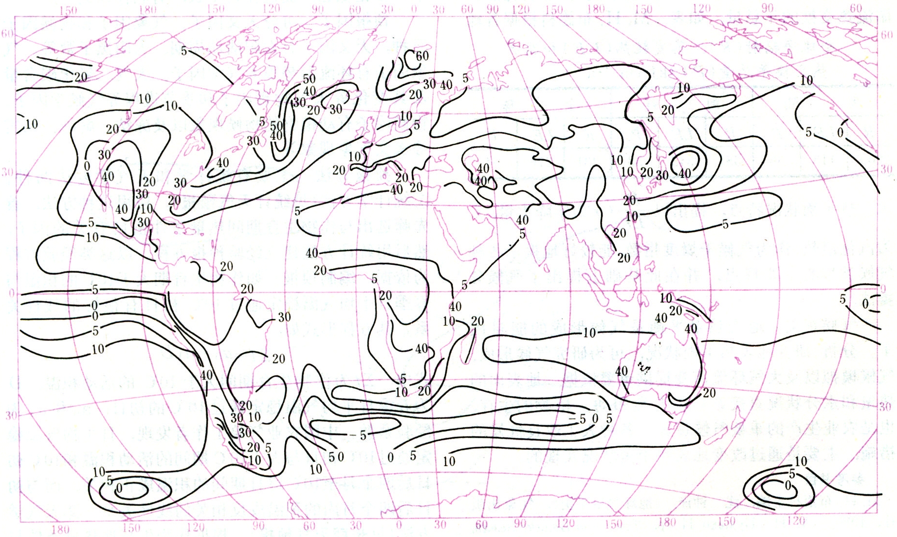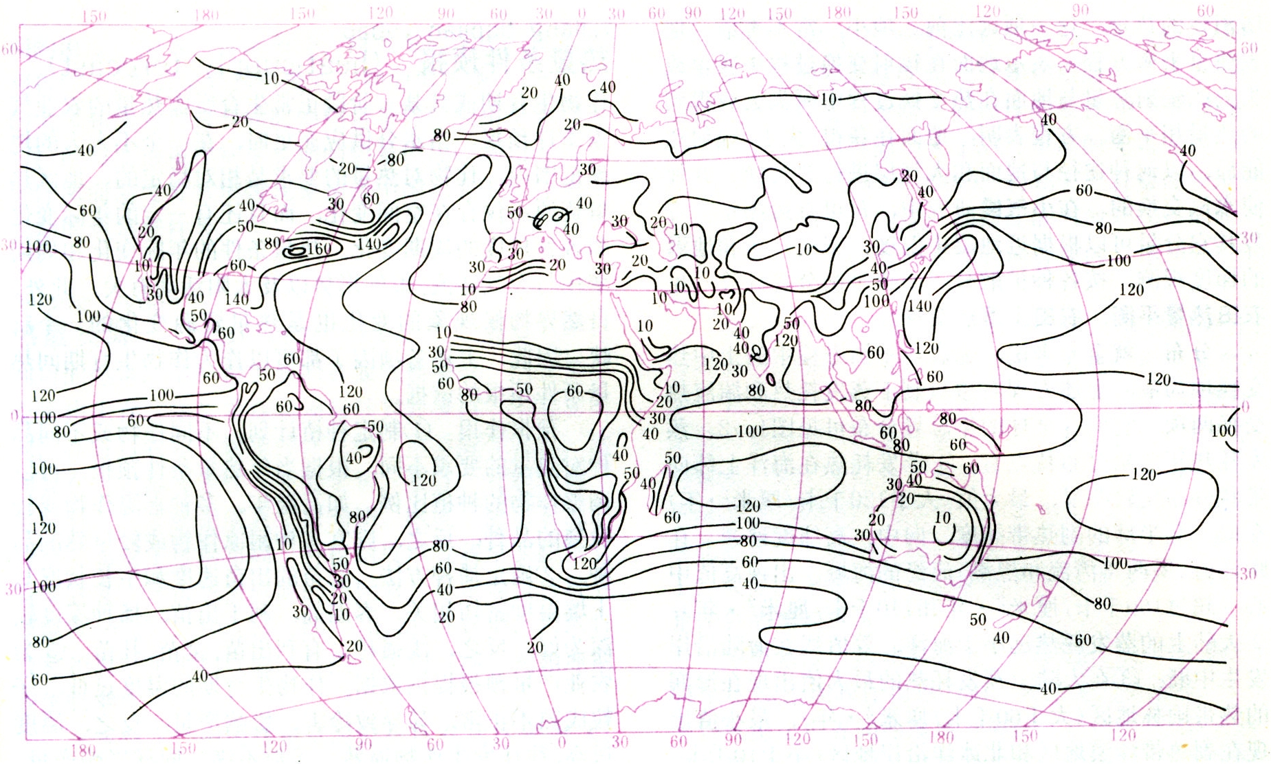 就全年来说,地表热平衡方程中的土中热交换项为零,上述方程右边只剩下蒸发耗热和湍流热交换两项。它们在全球的年总量分布可见图1、2。蒸发耗热年总量分布特点有:①蒸发耗热在海洋上纬向带状分布比较明显,最大值(大于120千卡/厘米2·年)在南、北半球的副热带纬度,向中、高纬度递减。在暖洋流(墨西哥湾流和黑潮)流经的海域,出现高值中心(超过160千卡/厘米2 ·年和140千卡/厘米2 ·年);②大陆上的蒸发耗热远小于海洋,等值线在海陆沿岸发生中断;③在大陆上蒸发耗热的最大值出现在湿润的热带雨林地区(大于60千卡/厘米2 ·年),最小值出现在副热带沙漠地区和北冰洋沿岸地区(小于10千卡/厘米2 ·年)。湍流热交换年总量的分布则相反,但其等值线在海陆沿岸也不连续;在暖洋流地区数值较大,以及在北冰洋沿岸数值很小等,则与蒸发耗热年总量是一致的。全球的净辐射(见辐射平衡)、蒸发耗热和湍流热交换的年总量,如表。М.И.布德科根据各地水、热平衡状况特点,提出以(γ为年降水量,L为汽化潜热)作为气候干燥度指数,能较好地揭示各种气候类型的主要特点,并在此基础上提出了气候分类法。