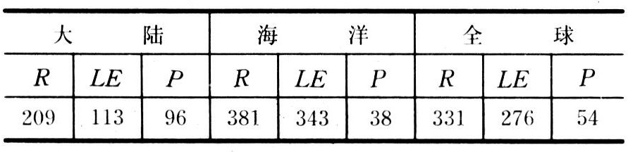 全球净辐射(R)、蒸发耗热(LE)和湍流热交换年总量(P)(kJ·cm-2·a-1)