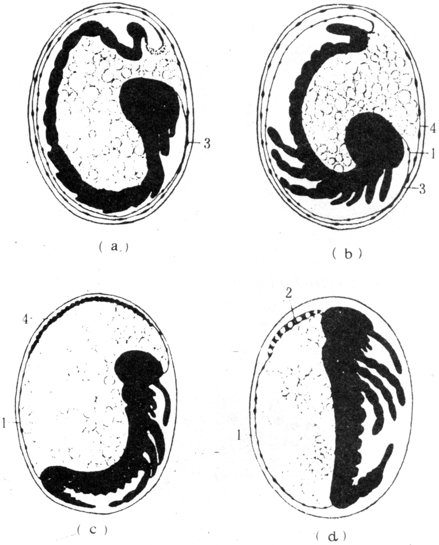 次级背器官存在于一些有翅亚纲昆虫,构造较简单,出现于胚动时期,来源于胚膜,如一种球螋Forficula次级背器官,在胚动之前,胚体开始缩短时,浆膜与羊膜在距离头部不远之处合并形成一小段结合区,原来的浆膜与羊膜,连接于结合区的边缘,不久结合区收缩,皱褶于胚胎的背部,呈管状下陷于卵黄中形成背器官(图3)羊膜则成为背合膜(darsal clorure)。背合膜随体壁腹面向背面伸展而逐渐缩小,终于完成体壁的背合。次级背器官,随着体壁形成过程中逐渐离解,并全部为卵黄所吸收。