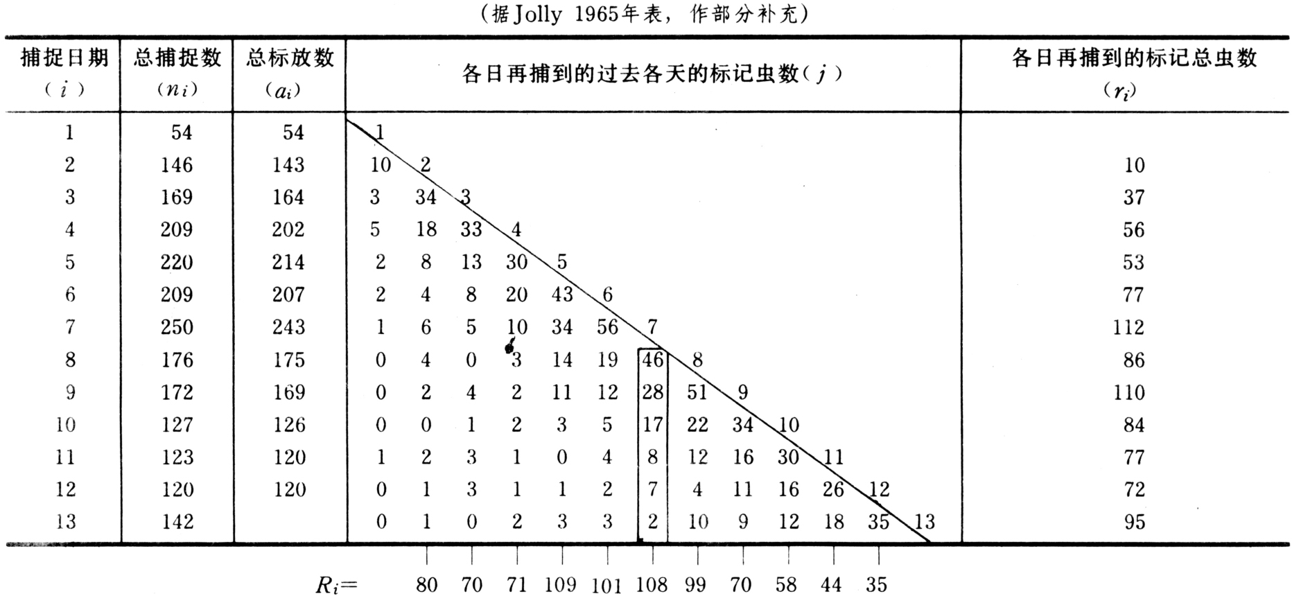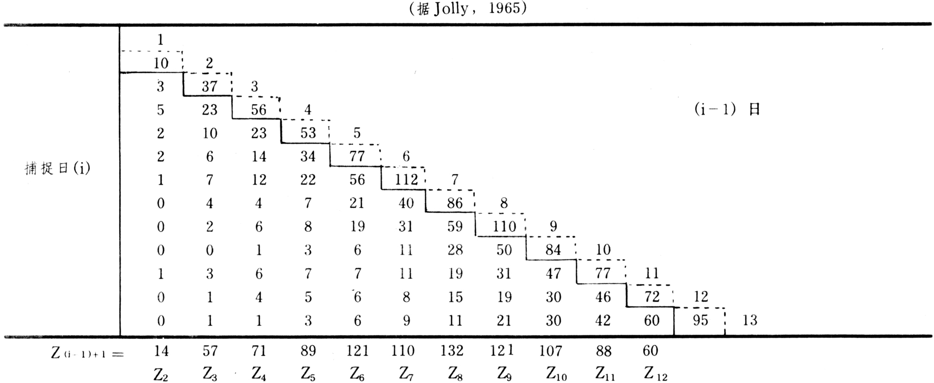 表2是由表1引出,表示在第i日捕到第j日(或j日以前)标记的再捕数(γ1),即表1中各行由左至右相加所得,如r7=1+6+5+10+34+56=112,在表2中各列粗线上端的数即ri。在i日以后捕到的标记数(Zi),见表2中除第一数以外的各列累加数,如Z7=40+31+11+11+8+9=110