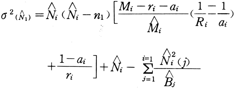 乔利一塞贝法由乔利(G.N.Jolly)和塞贝(G.A.F.Seber)提出,适用于多次标放和多次再捕的统计。此法采用随机模型不但可估算出某日的种群总数,而且可根据种群的扩散或生存过程的信息估算出种群的消失率(包括死亡与迁出)或渗入率(包括出生与迁入)。其数据列于表1。表中三角形数字排列部分为第i日再捕的过去各次标放的虫数,例如第七天捕捉总数n1=250,其中有第一至六天所标记的虫数分别为1,6,5,10,34,56头,共112头(用r1表示,r7=112),表中R1代表第i天标记释放的虫数,在i天以后各天再捕的累计数,如R7=46+28+17+8+7+2=108头。
