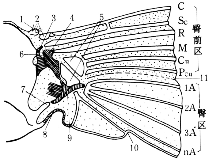翅基部有小骨片称翅关节片,用以控制翅的升降、折叠和飞行运动,通常包括翅基片、肩片、腋片及中片(图2)。翅基片是一对位于前翅前缘脉最基端的小骨片,鳞翅目、膜翅目及双翅目中比较发达,有时扩大,盖在翅基部。肩片是翅前缘基部的一块小骨片,和前缘脉基部有关节活动,在蜻蜓目中比较大。腋片是位于腋区的小骨片,为有翅昆虫所共有,一般有3或4片,腹面凸凹不平,着生有直接翅肌,是翅与胸部接连及折叠的重要关节,但在蜉蝣目、蜻蜓目昆虫中,腋区未分化为若干小腋片,故翅不能折动。第一腋片与前背翅突相接,前端突出,是亚前缘脉的支点;第二腋片内缘与第一腋片相接,前端顶接径脉基端,外缘与中片相接,腹面的凹陷与侧翅突支接,是翅运动的重要支点;第三腋片大致为三角形,里端与后背翅突支接,前角支接在第二腋片上,前缘连接中片,外端与臀脉支接;第四腋片极小,仅在直翅目、膜翅目中存在,位于第三腋片与后背翅突之间。中片位于翅基的中部,为内、外两块近三角形的骨片,前、后翅都有,是翅的重要折叠关节。内中片与第二及第三腋片相接,外中片外端与中脉和肘脉相接,二中片之间是基褶,翅折叠时,二中板沿基褶向上凸折。