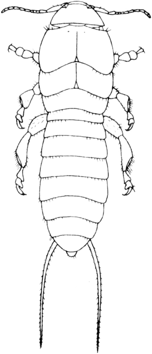 腹部11节,第八、九背板退化,有气门8对。尾须细长,略骨化,不分节,具毛(见图)。若虫与成虫相似。有4个龄期。外寄生于非洲Cricetomys属的鼠体上,食寄主表皮物质。