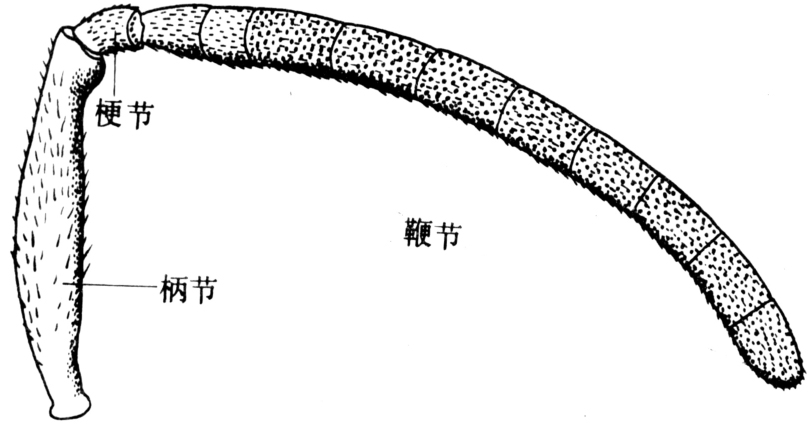 一般由柄节(scape)、梗节(pedicel)及鞭节(flagellum)组成(见图)。柄节位于基部,一般短而粗,基缘以膜与头壳相连,常支架在头壳的围角片上,受肌肉控制(见)作各方向运动。梗节为触角的第二节,常为环状。鞭节较长,包括许多由膜连接的小环节,这些节内一般没有肌肉,唯双尾目、弹尾目昆虫的鞭节有小的节内肌,因此它们并不相当于有翅亚纲昆虫鞭节的小环节。在半变态及增节变态类的昆虫中,鞭节的小环节在胚后发育中常随虫龄增长而增多。新分出的环节称为分生节(meriston),发生于端部或基部。