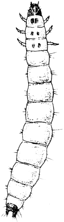 成虫体长6.5%10毫米,扁平椭圆形,黑色有光泽。头三角形,触角棒状,11节。前胸背板宽大于长,端缘凹形,两前角突出。前胸与鞘翅之间呈颈状相连。鞘翅长度是宽度的两倍。行间有两行小刻点,前足基节窝后方呈封闭式:跗节5节,唯第一节很小。幼虫长19~20毫米,长而扁平,头近长方形,体后半部较肥大,头部及尾端背面骨化区为赤褐至黑褐色。前胸盾及中、后胸背面两侧各有一对黑褐色斑,其余为乳白色。腹末具较大的黑褐色凹形臀叉(见图)。
