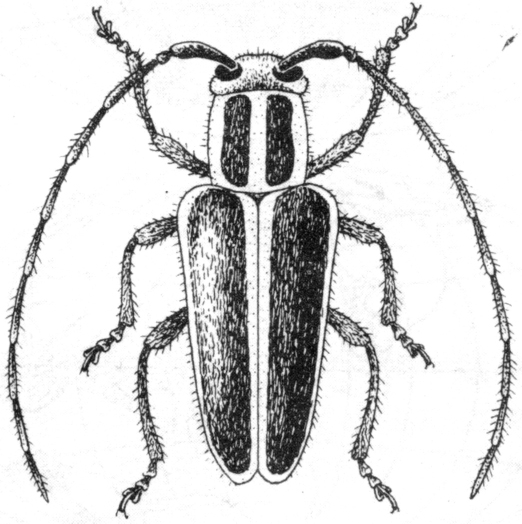 雌成虫体长13~18毫米,触角略短于虫体;雄成虫体长9~13毫米,触角稍长于虫体。体色墨绿,头、胸部背面、鞘翅正中及两侧各有3个黄白纵条,触角各节圆筒形,灰白色细毛与黑色相间(见图)。卵长椭圆,长约1.8毫米,宽0.5~0.9毫米,初产时黄白色,渐变黄褐到褐色。末龄幼虫体长15~20毫米,乳白色,前胸背板灰黄色,胸、腹部各节背面有唇形突一对。蛹长约17毫米,宽约6毫米,体色淡黄,复眼黑色。
