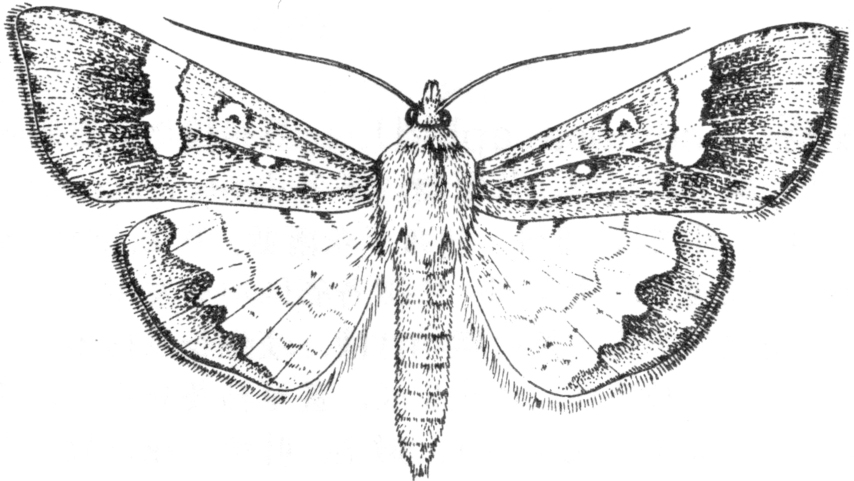 成虫体长10~13毫米,翅展20~26毫米。前翅烟褐色,从外缘向内有大、中、小透明斑各一块;后翅近外缘1/3处深褐,其余为一大块透明斑,在前缘近基部有小褐斑两块;停息时两翅水平展开;雄虫腹部末端有一小丛灰黑毛(见图)。卵扁平,长约0.6~0.9毫米米。初透明,不易找到;后渐橘红。卵壳上有六角形网状花纹。幼虫共5龄,1龄头壳宽0.197毫米,下龄头宽为前龄之1.63倍。初孵幼虫长1,0~1.5毫米,末龄13.0~15.0毫米,体黄绿有时带紫;中后胸背板前排各有毛片4个,各生两条刚毛,后排有斑两个,无刚毛;腹节背面毛片前4后2,各有一毛;趾钩双序缺环;毛片和斑棕褐。蛹长11~13毫米,体色由淡黄绿向棕褐转变。翅芽伸至第四腹节,触角、中足胫节和下颚等长,伸至第十腹节,棘突褐色,有臀棘8枚,末端向内卷曲。