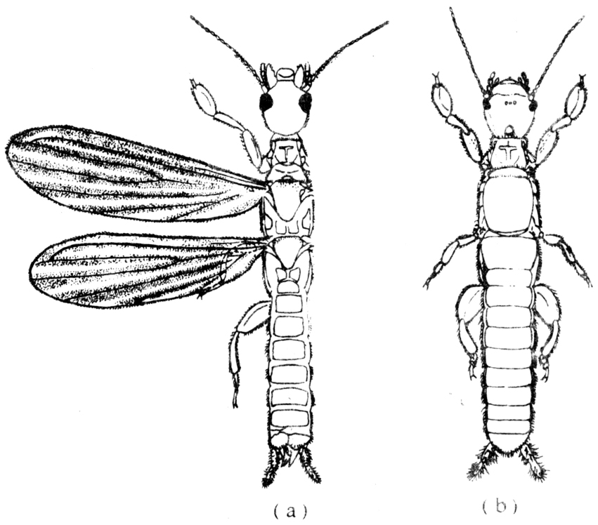 但后翅略小,翅面多毛,翅脉简单。前足粗壮、第一跗节膨大。中足瘦小,后足腿节膨大,跗节3节。腹部10节,尾须2节。雄虫腹部末节及尾须不对称,第十腹节背板中部常裂开,分成左右两个背片,左片常向后突出,末端分开成背爪,右片向后成背板突,端部常二分叉,成一背爪及一亚腹突或腹突。有些类群右片可能向中间突出。左尾须基节常膨大,内侧生一个或数个小瓣(见图)。