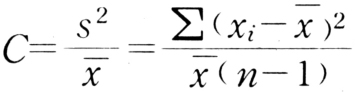 式中 为平均虫数;s2为方差;n为抽样数。若种群的扩散完全是随机的,则C应是符合均数为1.方差为2n/(n-1)2的正态分布。应用时,应统计出C=1的概率为95%的置信区间为: