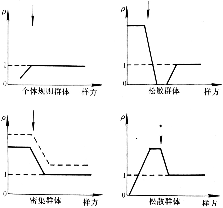 ,即相当于上述聚集指数。ρ指数除可用以分析种群空间分布型外,特别可用于估计个体群的面积。以样方单位的大小为横坐标,ρ值为纵坐标作图,根据图形的变化测定个体群的面积。①当分布的基本成分为个体或为密集的个体群时,ρ<1,样方小于个体群面积;ρ≥1,样方大于个体群面积;②当分布的基本成分为疏松的个体群时,ρ>1,样方小于个体群面积;ρ值显著下降,样方大于个体群面积。在二者的转折点处(如图上的箭头),所对应的样方单位大小,即可表示个体群的面积(见图)。