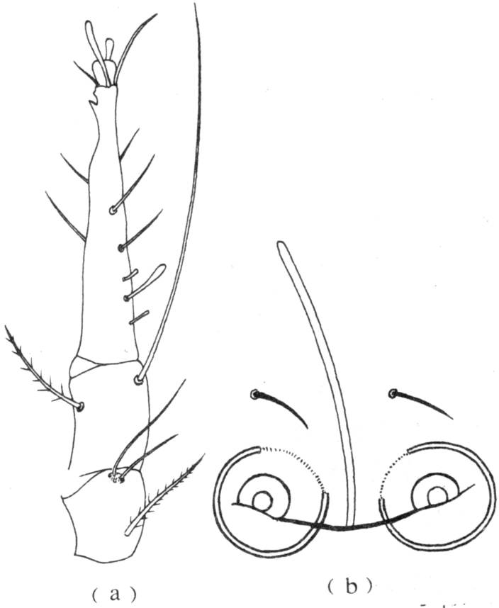 取食加工粮及食品,并造成霉变的贮粮害螨,又名粉螨。学名Tywphagus putrescentiae(Schrank)。蜱螨目,粉螨科。广布全世界。为害粉类、禾谷类、油籽类、豆类,也为害含脂肪蛋白质高的食品,如蛋粉、火腿、干酪、椰子干、鱼粉,喜取食粮粒胚部、真菌,促使贮粮发热霉变,人体接触能引起皮炎,俗称“谷痒症”。成螨体长280~415微米,雌大于雄,卵圆形,乳白色,具4对足,体躯上有成对的刚毛。前足体与后足体之间有一横沟,头部螯肢小,第一对足基部、基节上毛扁平,基部膨大(见图a)。各足胫节端部背面有一胫节管毛伸越跗节外,跗节末端具一发达的匙状爪。顶内毛极接近,且长,伸越螯肢末端,顶外毛较短,位于颚体两侧,胛内毛较胛外毛长,肩内毛较肩外毛长,第一对背毛最短,第二对背毛长于第一对背毛的2~3倍,第三对背毛和第四对背毛更长,伸出体后,后侧毛较前侧毛长6倍,肛门后有3对后肛毛,第一和第二对长。雄虫腹面肛门旁有圆盖形吸盘一对(见图b)。卵长115微米,长椭圆形,幼螨长150微米,具3对足。若螨长220~350微米,随龄期而异,具4对足,均呈乳白色。雌成螨一经交配后即产卵,在温度28~30℃,相对湿度在83~92%下,卵经4~6天孵化为幼螨,取食3天后停止活动,头足向下弯曲进入静止期,经一天后蜕皮成第一若螨,再取食,静止,经蜕皮即成第二若螨,以后再蜕皮成为成螨,一代需时12~14天,喜群居。常生活在较潮湿生霉的贮粮与食物中。产在霉菌中的卵发育快,易繁殖成较大种群。在温度22~24℃,相对湿度100%时,一对成螨至50天后,繁殖数可达7200头,尚有未孵化卵1200粒。粮堆中密度大时,常栖息在表面层,干燥的贮粮很少发生螨。在高温45℃,1小时即死亡。氯化苦熏蒸对卵无效。螨能借风力、老鼠、昆虫以及人的衣服、鞋袜、检查工具等接触物而传播。宜经常保持仓房,器材,装具的清洁,贮粮要干燥,消灭老鼠、昆虫等携带螨类的动物。检查粮情时,每检查完一仓,立即将衣服鞋袜和检查工具清扫干净,然后再检查另一仓。可利用高温、曝晒、烘干处理虫粮或采用氯化苦、磷化铝间歇熏蒸可以杀死幼螨、若螨、成螨。