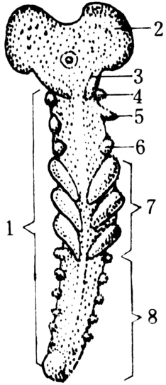 节肢动物(包括昆虫纲)体节侧面成对的分节管状物。各附肢的两个相邻环节间有关节及关节膜相连,整个附肢及其各节都靠肌肉活动。原始的附肢是运动器官,但在各类群中或在同一个体的不同部位,附肢已转化成不同功能的器官。昆虫胚胎期除头前叶和尾节外,每个体节都可能有一对附肢(图1)。孵化前或在胚胎期,一些附肢消失。附肢一般不超过7节,多数为6节。每节都有一定的名称。