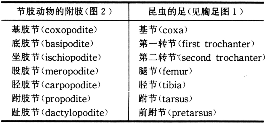 节肢动物(包括昆虫纲)体节侧面成对的分节管状物。各附肢的两个相邻环节间有关节及关节膜相连,整个附肢及其各节都靠肌肉活动。原始的附肢是运动器官,但在各类群中或在同一个体的不同部位,附肢已转化成不同功能的器官。昆虫胚胎期除头前叶和尾节外,每个体节都可能有一对附肢(图1)。孵化前或在胚胎期,一些附肢消失。附肢一般不超过7节,多数为6节。每节都有一定的名称。昆虫学中,昆虫附肢采用了与节肢动物不同的名称,以足为例,按其同源关系,可对照如下表:
