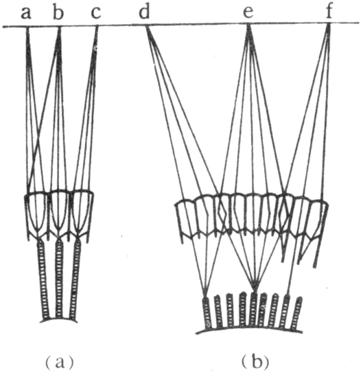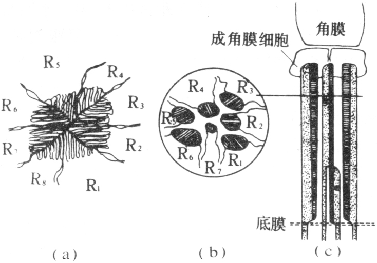 由若干数目感光单位(小眼)构成(图1)。每复眼内小眼数少者仅一个,多者上万。小眼外观多呈六角形小眼面,由外表的集光器和其下的感光器构成。集光器包括角膜和晶锥。角膜和分泌角膜的角膜细胞各相当于表皮和皮细胞。多数昆虫小眼晶锥为4个晶体细胞构成的透明体,名晶锥眼或真晶眼;半翅目、双翅目和一些甲虫小眼的晶体细胞未发展成晶锥,为无晶(锥)眼;鞘翅目中如萤科、花萤科、叩甲科等小眼的晶锥由角膜内突形成,称外晶眼或伪晶眼。感光器一般由8个网膜细胞(图2,R示网膜细胞)及向内分布的密集微绒毛形成的视杆组成,视杆下连视神经,每个小眼内的视杆以一定的形式汇集成视杆束,视杆束有3种类型:①非融合视杆束(视杆间有空隙)见于双翅目、水生半翅目和鞘翅目的扁甲和天牛;②整体融合视杆束,见于等翅目、膜翅目、蜚蠊目、半翅目和直翅目;③横层融合视杆束,见于缨尾目、弹尾目、鞘翅目和鳞翅目。视杆束是接受和传递视觉信息的功能单位。融合的视杆束下连的视神经形成视神经束,与神经节层的中间神经元相接,形成内导通道。蝇类复眼由于小眼中的视杆束是空腔型的,7个视杆分开,每小眼中从视杆延伸的视神经可与另小眼的视神经交叉并形成视神经束,然后与中间神经元相接。角膜细胞和网膜细胞外各围有角膜色素细胞(或称第一睛帘细胞)和网膜色素细胞(或称第二睛帘细胞)以同相邻小眼隔离。昼出性昆虫复眼的视杆直接与晶锥相接,只接受射入本小眼内的光点,其他斜射光均被色素细胞吸收,诸小眼光点并列镶嵌成像,称并列像。夜出性昆虫视杆不直接连晶锥,其间隔为一段纤维状透明介质,视杆既接受射入本小眼内的光,又可接受由邻近若干小眼折射或反射进入的光,物像由重叠光点构成,称重叠像(图3)。兼具昼出和夜出性的昆虫,色素细胞内的色素颗粒随光线的强弱移动。夜间色素向前移,使晶锥后端无色素相隔,能充分利用有限的光量,形成重叠像。增强时,部分色素后移,各小眼只能感受一个直射点,形成并列像。蝇类由于不同小眼的视杆视神经组合成为视神经束,在机能上其视觉内导有似重叠像眼的作用,故称为神经重叠像眼。