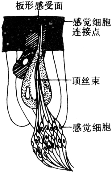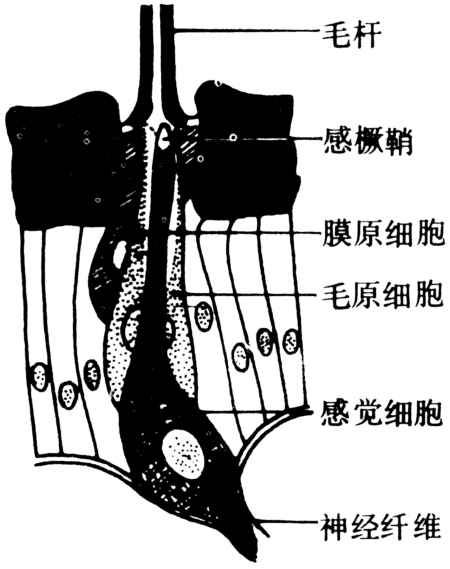 分为①毛形感受器:速度敏感型者为外感器,以口器、触角、尾须处为多;压力敏感型者为内感器,主要存在于生殖器。毛形感受器的构造与刚毛类同(图4),唯在毛原细胞下连有感觉细胞。感觉细胞一端包在感橛鞘内,与毛杆基部相接,另一端为向内的感觉神经纤维,能感受毛杆弯曲时产生的刺激。②钟形感受器。构造与毛形感觉器相似,唯表面呈圆顶形陷入表皮的凹处。多分布于足、翅基和平衡棒处。水生昆虫可感受水的压力,陆生昆虫可感受气压的变化,也可感受表皮弯曲时的机械刺激。③毛板感受器。由许多毛形感受器组合而成,可感受节间膜折叠或关节移动的刺激,常为“位置”感受器。螳螂颈部有两对毛板,可提供头和前胸相对位置的信息。此种信息与复眼的定位结合,可提高捕捉猎物的成功率。④剑梢感受器,亦称橛形感受器。感受器两端各联在相应的体壁下,由3个细胞——感觉细胞、冠细胞和围细胞组成,感觉细胞位于基部,中间为围细胞,顶端为连接于表皮下的冠细胞。感觉细胞具有特化的末梢,被包在围细胞顶端的部分是尖形中空的剑稍体。末端以端丝穿过冠细胞伸达表皮(图5)。分布于触角、足和翅基部,能感受与其相连表皮所发生的张力变化,与昆虫的对称运动及飞行定向有关。