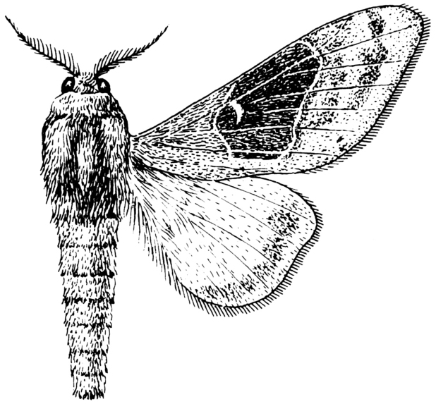 学名Metanastria terminalis Tsai et Hou,分布于中国福建和广东。寄主有橄榄和鸡尖树。幼虫食叶颇为严重。成虫体长30~35毫米,棕褐至赤褐色。雌前翅有3条横带,亚外缘部有由约7个黑色斑点组成的点列;后翅外半部暗褐色。雄触角前半部羽枝较短,前翅色深暗,中部有一深咖啡色似三角形斑,为银灰色的内、外横带所包围,各以白线纹为边,三角斑内有一黄褐色新月形小斑纹,亚外缘斑点列黑褐色。后翅外半部有污褐色斜横带(图2)。