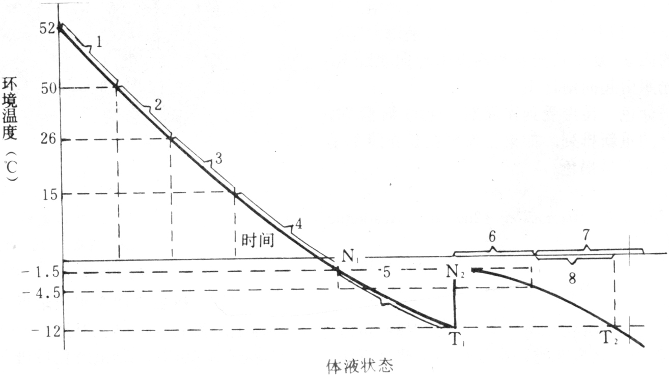 (anabiosis)理论,他提出当外界温度低于冰点时,昆虫体液处于过冷却阶段,呈冷昏迷状态,但不致生理失调;此时如环境温度回升,昆虫仍可恢复正常活动。当体温下降到零下某一点(T1)时,虫体组织细胞内放出潜热,使体温突然回升到接近0℃(绝不达到0℃)的地方。上述释放潜能的起点(Ti)称为过冷却点(supercooling point)或临界点。然后体液开始冻结(N2)。