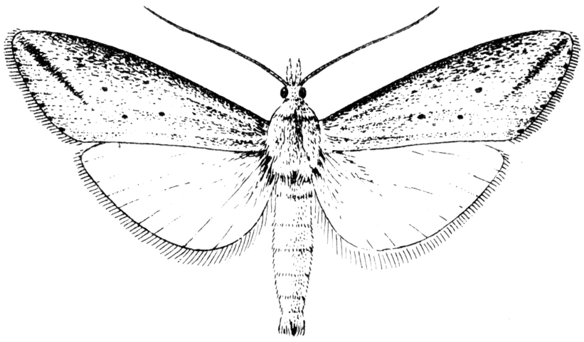 以水稻为主的蛀茎害虫。学名Catagella adjurella Walker。鳞翅目,螟蛾科。分布于东南亚、印度、斯里兰卡及中国南方稻区。为害水稻,并取食稗、鸭舌草、荆三棱等。雌蛾体长约10毫米,翅展20~23毫米。前翅黄褐,前缘褐色,自顶角至后缘有一褐色斜纹,翅中央有3个棕褐色小点,呈等边三角形排列,外缘有7个棕褐色小点,缘毛淡黄(见图);后翅银灰,腹部黄白色,尾部簇生灰黄色鳞片,产卵时用以覆盖卵块。雄蛾体长7~8毫米,翅展16~19毫米。前翅灰黄,翅尖斜纹及小点比雌蛾明显,腹部黄褐色,尾端无鳞毛。卵乳白,孵化前青黑色。卵块长椭圆形,覆盖灰黄色鳞毛,较三化螟卵块鳞毛色泽稍浅而匀称,无杂色,排列较稠密。末龄幼虫体长15~20毫米,头深褐色,胸腹部基本绿色,自腹部第二节后,渐次转黄。蛹长11~13毫米,初期黄绿,后变淡黄,羽化前为黄褐色,茧色白。
