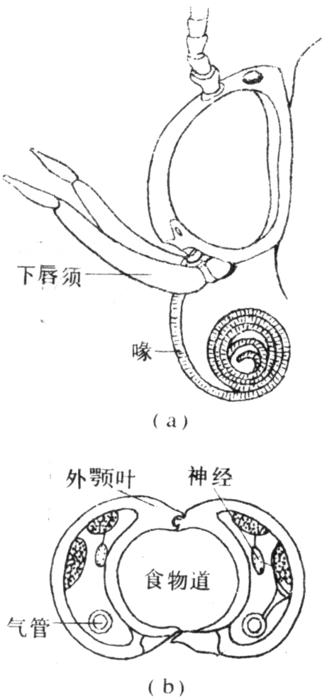 适于吮吸花蜜、果汁等液态食物的口器。为鳞翅目蛾蝶类所特有。下颚外颚叶延长,形成能卷曲并富有弹性的长喙(图a)。外颚叶的横切面呈弦月形,腔内充满血液,其中有气管、神经及沿外颚叶壁斜伸的短肌,左右两外颚叶在背腹面衔接凑合成喙,形成食物道(图b)。除了末端的孔和口腔基部的开口外,喙腔是密封的,只能纵向滑动。抽吸机构就是食窦—咽喉唧筒。口位于喙基部。平常喙卷缩在两下唇须间,取食时,喙伸肌收缩,迫使部分血液涌入外颚叶腔,喙因而伸展,液体食物由喙的开口吸入食物道而后入口,当喙伸肌放松时,外颚叶内肌收缩,血液由外颚叶向后流,喙遂卷曲。