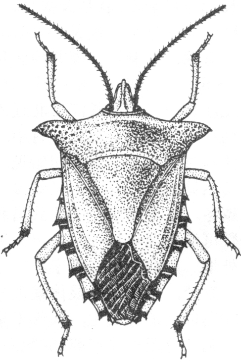 刺吸柑橘果实汁液的蝽类害虫。学名Rhynchocoris humeralis(Thunberg)。半翅目,蝽科。分布于南亚、东南亚及中国长江流域以南。成虫体长约22毫米,长盾形,绿色。前胸背板前缘两侧成角状突出,“屑”的边缘黑色,其上有较多粗大黑色刻点。触角5节。小盾片长而大,舌形,亦有刻点。前翅绿色(见图)。卵球形,淡绿色。常14粒聚成卵块。若虫5龄,1~3龄体淡黄色至赤黄色,有黑斑;第四龄胸部绿色,腹部黄色,翅芽显著;第五龄全体绿色。 角屑蝽 在中国南方年生1代。以成虫在果树枝叶茂密处、屋瓦片下和石隙等荫蔽场所越冬。越冬成虫于4月间开始活动,取食交配。5~10月产卵,卵块多见于叶面,7月间卵量最多。8月若虫盛发,为害严重,至11月大部分羽化为成虫。成虫和若虫都用口针插入果肉,吸食汁液,一次吸食时间可长达4小时,刺孔伤口附近逐渐变黄,果实未及成熟先行脱落,严重时落果遍地;未脱落者果形变小,品质下降。第一龄若虫聚集于叶片或果上,并不加害。第二龄若虫开始分散。2、3龄若虫常三五成群集中在果上吸害,是引致落果的主要虫期。4、5龄若虫和成虫活动力强,分散为害,受害果较少脱落。蜕皮时,先以口针