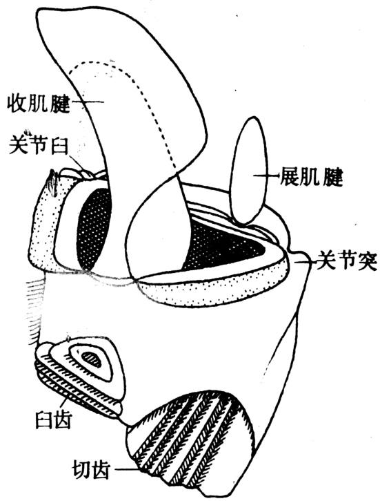 粗壮坚硬,基部略呈三角形,向端部渐扁,下部分化为切齿及臼齿。前者用于切碎食物,后者用于磨碎食物。上颚外缘分别以前关节臼及后关节突与头壳相连;巨大的收肌腱及较小的展肌腱分别着生在其基部内角及外缘后方(图1)。