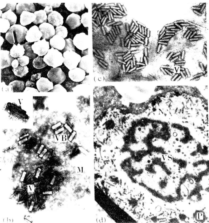 研究得最早和最为详细的一类病毒。因包涵体呈多角体(在光学显微镜下极易看到)和只在寄主细胞核内复制而得名。多角体通过幼虫食入,肠道消化液的消化,释放出有感染性的病毒粒子;病毒粒子穿过肠壁细胞和微绒毛膜,侵染敏感的组织、细胞。游离的病毒粒子随机包埋在结晶蛋白之中,形成一个个含有杆状病毒粒子的多角体(图1a)。病毒粒子的包埋类型有:单粒包埋(SEV),病毒中只含一个病毒粒子(图1c);多粒包埋(MEV),两个以上粒子成束包埋(图1b)。包涵体的形成由病毒本身决定。核型多角体DNA分子呈双链结构,病毒粒子结构复杂,约含10~25个多肽。以鳞翅目许多昆虫为寄主的多角体病毒主要感染血细胞、脂肪体细胞(图1d)、气管底膜细胞、体壁细胞和肠道细胞等;以膜翅目叶蜂类为寄主时,则只局限于感染幼虫中肠的细胞。患核型多角本病毒病的幼虫食欲减退、反应迟钝、体色灰白、后期体壁肿胀、轻触即破,从感病到死亡的时间取决于寄主、食入多角体数量、虫龄及环境温度等因素,一般需4天以上。多角体病毒的寄主仅限于昆虫,以鳞翅目为主,还有膜翅目、双翅目、鞘翅目、脉翅目、毛翅目的一些种类。其致病力强并有后效。对人畜安全,作为微生物杀虫剂比较理想,可进一步开发利用,在国际上已有多种登记生产。中国目前应用于大田防治的有油桐尺蠖NPV、棉铃虫NPV、茶毛虫NPF等,均获良好效果。由于NPV多角体蛋白基因启动子表达能力强,病毒对外源DNA容量大,因此它又是当今基因工程中的良好载体。